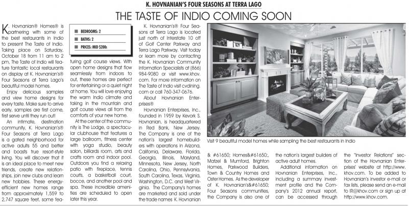 K. Hovnanian’s® Four Seasons at Terra Lago is located just north of Interstate 10 off of Golf Center Parkway and Terra Lago Parkway. Visit today or learn more by contacting the K. Hovnanian Community Information Specialists at (866) 984-9080 or visit www.khov. com. For more information on The Taste of Indio visit cvdining. com or call 760-347-0676.