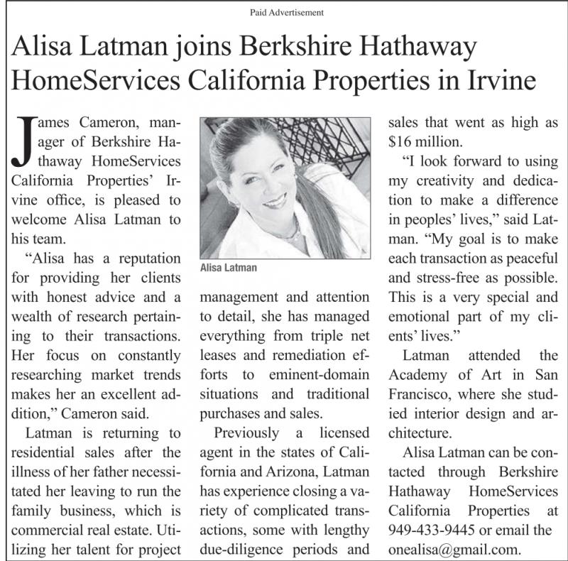 James Cameron, manager of Berkshire Hathaway HomeServices California Properties’ Irvine office, is pleased to welcome Alisa Latman to his team. “Alisa has a reputation for providing her clients with honest advice and a wealth of research pertaining to their transactions. Her focus on constantly researching market trends makes her an excellent addition,” Cameron said. Latman is returning to residential sales after the illness of her father necessitated her leaving to run the family business, which is commercial real estate. Utilizing her talent for project Paid Advertisement management and attention to detail, she has managed everything from triple net leases and remediation efforts to eminent-domain situations and traditional purchases and sales. Previously a licensed agent in the states of California and Arizona, Latman has experience closing a variety of complicated transactions, some with lengthy due-diligence periods and Alisa Latman joins Berkshire Hathaway HomeServices California Properties in Irvine Alisa Latman sales that went as high as $16 million. “I look forward to using my creativity and dedication to make a difference in peoples’ lives,” said Latman. “My goal is to make each transaction as peaceful and stress-free as possible. This is a very special and emotional part of my clients’ lives.” Latman attended the Academy of Art in San Francisco, where she studied interior design and architecture. Alisa Latman can be contacted through Berkshire Hathaway HomeServices California Properties at 949-433-9445 or email the onealisa@gmail.com.