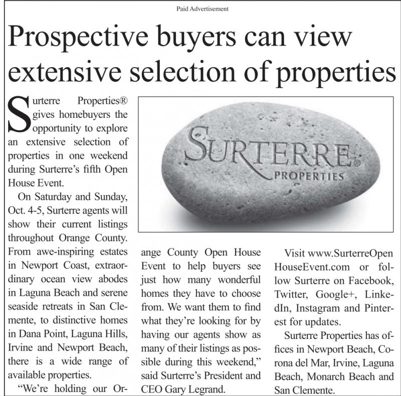 On Saturday and Sunday, Oct. 4-5, Surterre agents will show their current listings throughout Orange County. From awe-inspiring estates in Newport Coast, extraordinary ocean view abodes in Laguna Beach and serene seaside retreats in San Clemente, to distinctive homes in Dana Point, Laguna Hills, Irvine and Newport Beach, there is a wide range of available properties.