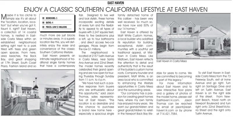 For more information about East Haven and to view interactive floor plans and a gallery of photos of the model home, please visit EastHaven14.com. Jason Thomas can be reached by email at jasont@easthaven14.com or by phone at 714.421.7584.