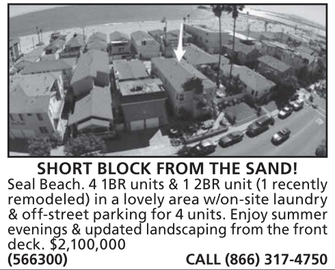 SHORT BLOCK FROM THE SAND! Seal Beach. 4 1BR units & 1 2BR unit (1 recently remodeled) in a lovely area w/on-site laundry & off-street parking for 4 units. Enjoy summer evenings & updated landscaping from the front deck. $2,100,000 (566300) CALL (866) 317-4750