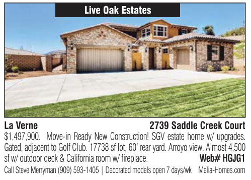 La Verne 2739 Saddle Creek Court $1,497,900. Move-in Ready New Construction! SGV estate home w/ upgrades. Gated, adjacent to Golf Club. 17738 sf lot, 60’ rear yard. Arroyo view. Almost 4,500 sf w/ outdoor deck & California room w/ fireplace. Web# HGJG1 Call Steve Merryman (909) 593-1405 | Decorated models open 7 days/wk Melia-Homes.com