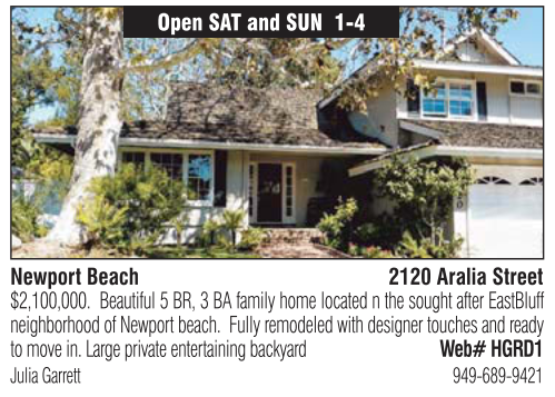 Open SAT and SUN 1-4 Newport Beach 2120 Aralia Street $2,100,000. Beautiful 5 BR, 3 BA family home located n the sought after EastBluff neighborhood of Newport beach. Fully remodeled with designer touches and ready to move in. Large private entertaining backyard Web# HGRD1 Julia Garrett 949-689-9421