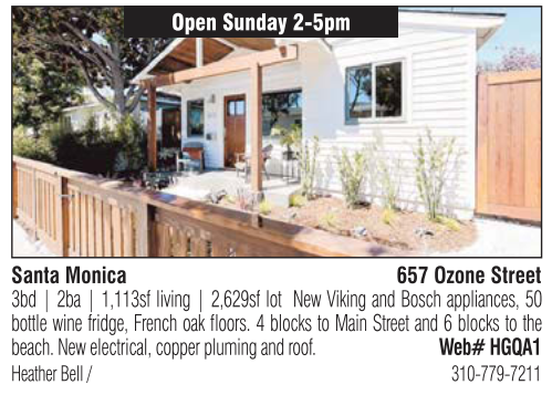 Santa Monica 657 Ozone Street 3bd | 2ba | 1,113sf living | 2,629sf lot New Viking and Bosch appliances, 50 bottle wine fridge, French oak floors. 4 blocks to Main Street and 6 blocks to the beach. New electrical, copper pluming and roof. Web# HGQA1 Heather Bell / 310-779-7211 Open Sunday 2-5pm