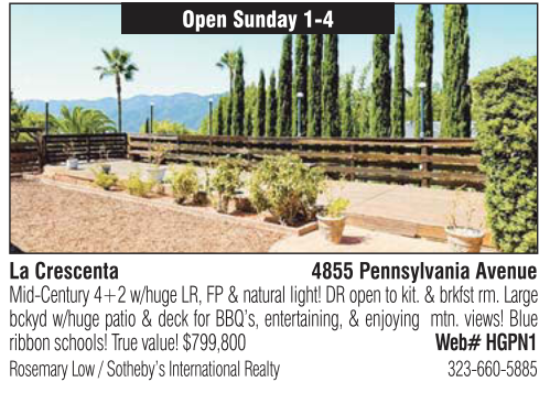 La Crescenta 4855 Pennsylvania Avenue Mid-Century 4+2 w/huge LR, FP & natural light! DR open to kit. & brkfst rm. Large bckyd w/huge patio & deck for BBQ’s, entertaining, & enjoying mtn. views! Blue ribbon schools! True value! $799,800 Web# HGPN1 Rosemary Low / Sotheby’s International Realty 323-660-5885