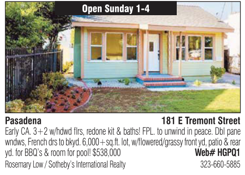 Pasadena 181 E Tremont Street Early CA. 3+2 w/hdwd flrs, redone kit & baths! FPL. to unwind in peace. Dbl pane wndws, French drs to bkyd. 6,000+sq.ft. lot, w/flowered/grassy front yd, patio & rear yd. for BBQ’s & room for pool! $538,000 Web# HGPQ1 Rosemary Low / Sotheby’s International Realty 323-660-5885