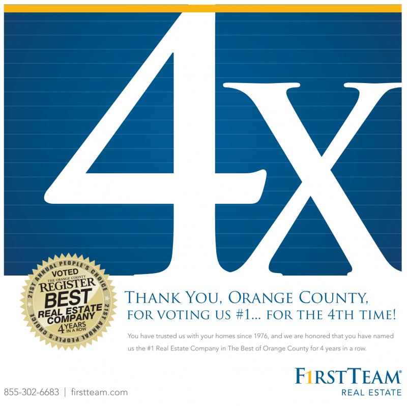 Thank You, Orange County, for voting us #1... for the 4th time! You have trusted us with your homes since 1976, and we are honored that you have named us the #1 Real Estate Company in The Best of Orange County for 4 years in a row. 855-302-6683 | firstteam.com4X