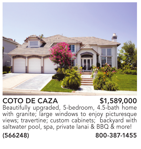 COTO DE CAZA $1,589,000 Beautifully upgraded, 5-bedroom, 4.5-bath home with granite; large windows to enjoy picturesque views; travertine; custom cabinets; backyard with saltwater pool, spa, private lanai & BBQ & more! (566248) 800-387-1455