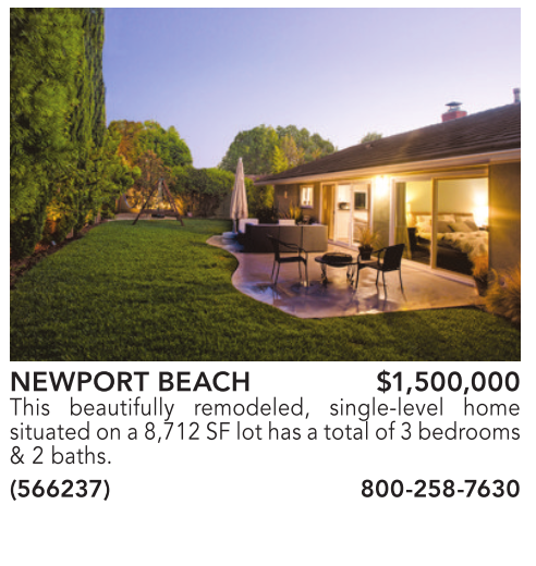 NEWPORT BEACH $1,500,000 This beautifully remodeled, single-level home situated on a8,712 SF lot has atotal of 3bedrooms & 2 baths. (566237) 800-258-7630