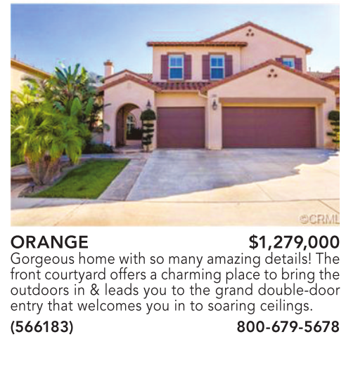 ORANGE $1,279,000 Gorgeous home with so many amazing details! The front courtyard offers acharming place to bring the outdoors in & leads you to the grand double-door entry that welcomes you in to soaring ceilings. (566183) 800-679-5678