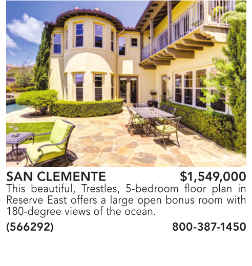 SAN CLEMENTE $1,549,000 This beautiful, Trestles, 5-bedroom floor plan in Reserve East offers a large open bonus room with 180-degree views of the ocean.