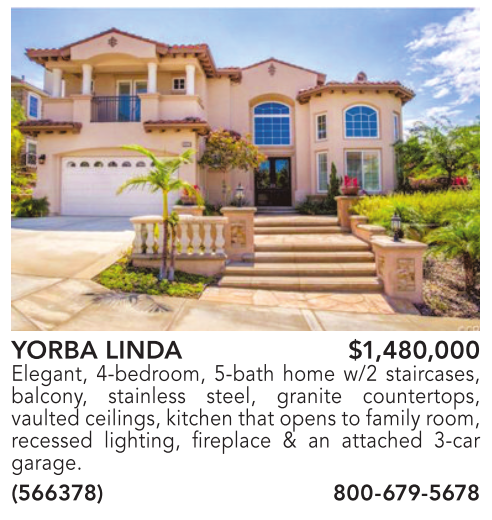 YORBA LINDA $1,480,000 Elegant, 4-bedroom, 5-bath home w/2 staircases, balcony, stainless steel, granite countertops, vaulted ceilings, kitchen that opens to family room, recessed lighting, fireplace & an attached 3-car garage. (566378) 800-679-5678