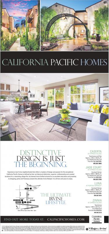 California Pacific Homes is defined by their architectural distinction, superior craftsmanship and coveted locations for a rewarding village life. Acclaimed Irvine Unified schools for an excellent education and proximity to shopping, parks and freeways present the ultimate Irvine lifestyle. It is all here and yours to enjoy.