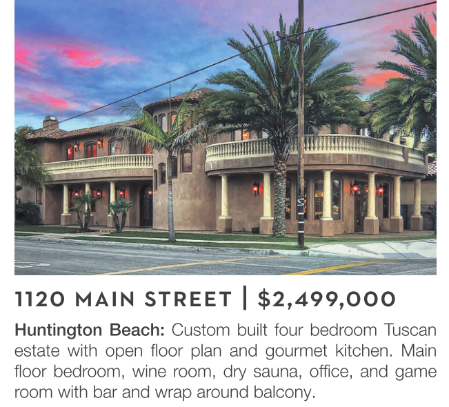 Huntington Beach: Custom built four bedroom Tuscan estate with open floor plan and gourmet kitchen. Main floor bedroom, wine room, dry sauna, office, and game room with bar and wrap around balcony.