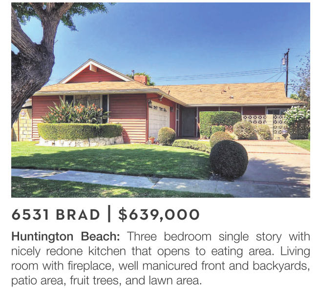 Huntington Beach: Three bedroom single story with nicely redone kitchen that opens to eating area. Living room with fireplace, well manicured front and backyards, patio area, fruit trees, and lawn area.