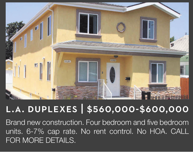 Brand new construction. Four bedroom and five bedroom units. 6-7% cap rate. No rent control. No HOA. CALL FOR MORE DETAILS.