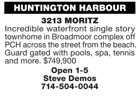 3213 MORITZ Incredible waterfront single story townhome in Broadmoor complex off PCH across the street from the beach. Guard gated with pools, spa, tennis and more. $749,900 Open 1-5 Steve Demos 714-504-0044