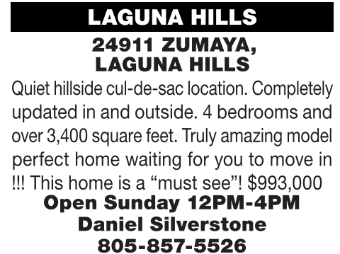 LAGUNA HILLS 24911 ZUMAYA, LAGUNA HILLS Quiet hillsidecul-de-saclocation.Completely updated in and outside. 4 bedrooms and over3,400 square feet.Truly amazingmodel perfect home waiting for you to move in !!! This home is a “must see”! $993,000 Open Sunday 12PM-4PM Daniel Silverstone 805-857-5526