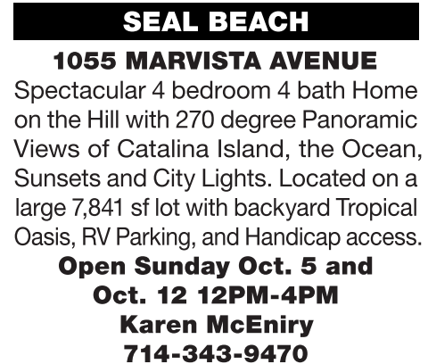 Open Sunday Oct. 5 and Oct. 12 12PM-4PM Karen McEniry 714-343-9470