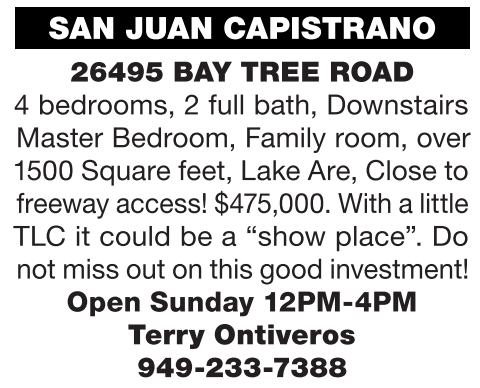SAN JUAN CAPISTRANO 26495 BAY TREE ROAD 4 bedrooms, 2 full bath, Downstairs Master Bedroom, Family room, over 1500 Square feet, Lake Are, Close to freeway access! $475,000. With a little TLC it could be a “show place”. Do not miss out on this good investment! Open Sunday 12PM-4PM Terry Ontiveros 949-233-7388