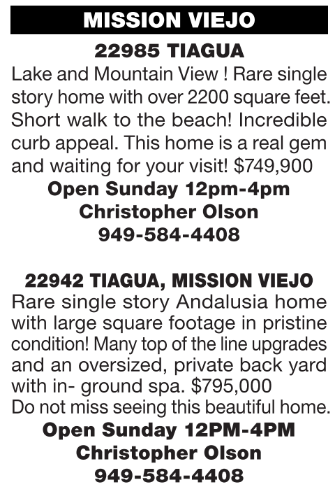 MISSION VIEJO 22985 TIAGUA Lake and Mountain View ! Rare single story home with over 2200 square feet. Short walk to the beach! Incredible curb appeal. This home is a real gem and waiting for your visit! $749,900 Open Sunday 12pm-4pm Christopher Olson 949-584-4408 22942 TIAGUA, MISSION VIEJO Rare single story Andalusia home with large square footage in pristine condition! Many top of the line upgrades and an oversized, private back yard with in- ground spa. $795,000 Do not miss seeing this beautiful home. Open Sunday 12PM-4PM Christopher Olson 949-584-4408