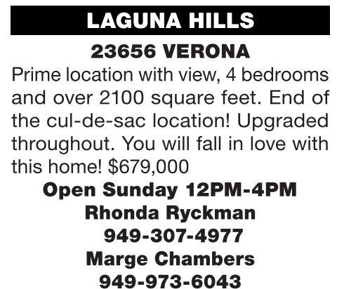 23656 VERONA Prime location with view, 4 bedrooms and over 2100 square feet. End of the cul-de-sac location! Upgraded throughout. You will fall in love with this home! $679,000 Open Sunday 12PM-4PM Rhonda Ryckman 949-307-4977 Marge Chambers 949-973-6043