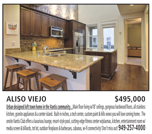 ALISO VIEJO $495,000 Urban designed loft townhome in theVantis community…Main floorliving w/18’ceilings,gorgeous hardwood floors, allstainless kitchen, granite appliances&acenter island. Built-inniches, atechcenter,custompaint &hillsviewsyou will love cominghome. The onsite Vantis Club offersaluxurious lounge, resort-style pool, cutting-edge fitnesscenter w/plasmas,kitchen,entertainment room w/ mediascreen &billiards,tot lot,outdoor fireplaces&barbecues, cabanas,wi-fi connectivity! Don’tmissout!949-257-4000