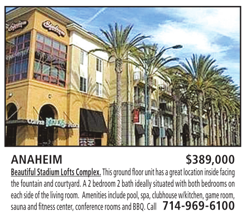 ANAHEIM $389,000 BeautifulStadiumLofts Complex. This groundfloorunithas agreat location insidefacing thefountain andcourtyard. A2bedroom2bathideally situated with both bedrooms on eachsideofthe living room. Amenitiesinclude pool, spa, clubhousew/kitchen,gameroom, saunaand fitnesscenter,conference roomsand BBQ. Call 714-969-6100
