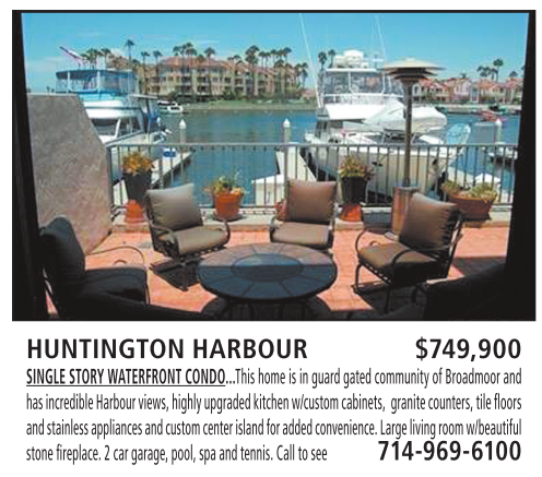 HUNTINGTON HARBOUR $749,900 SINGLE STORY WATERFRONT CONDO...This home is in guard gated community ofBroadmoor and has incredible Harbour views, highly upgraded kitchen w/customcabinets, granite counters, tile floors andstainless appliancesand customcenter island for added convenience.Large living room w/beautiful stone fireplace.2car garage, pool, spaand tennis.Calltosee 714-969-6100