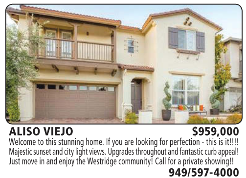 ALISO VIEJO $959,000 Welcome to this stunning home. If you are looking for perfection - this is it!!!! Majestic sunset and city light views. Upgrades throughout and fantastic curb appeal! Just move in and enjoy the Westridge community! Call for a private showing!!