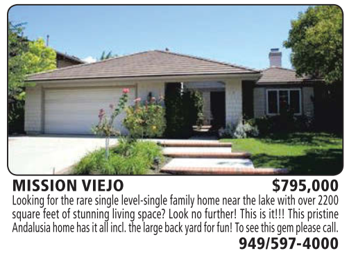 MISSION VIEJO $795,000 Looking for the rare single level-single family home near the lake with over 2200 square feet of stunning living space? Look no further! This is it!!! This pristine Andalusia home has it all incl. the large back yard for fun! To see this gem please call.