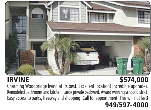IRVINE $574,000 Charming Woodbridge living at its best. Excellent location! Incredible upgrades. Remodeled bathrooms and kitchen. Large private backyard. Award winning school district. Easy access to parks, freeway and shopping! Call for appointment! This will not last! 949/597-4000 See also