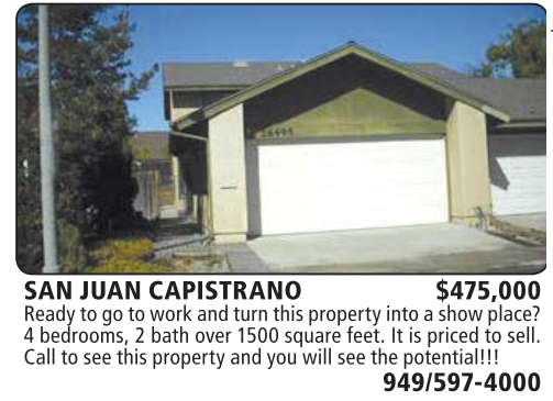 SAN JUAN CAPISTRANO $475,000 Ready to go to work and turn this property into a show place? 4 bedrooms, 2 bath over 1500 square feet. It is priced to sell. Call to see this property and you will see the potential!!!
