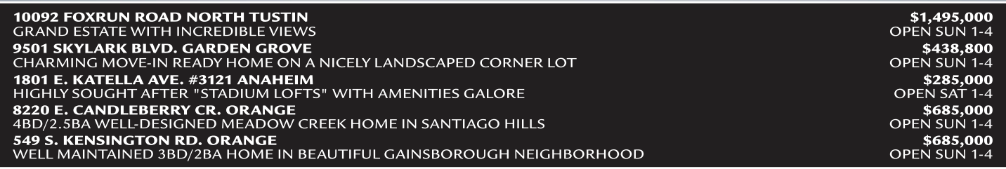10092 FOXRUN ROAD NORTH TUSTIN $1,495,000 GRAND ESTATE WITH INCREDIBLE VIEWS OPEN SUN 1-4 9501 SKYLARK BLVD. GARDEN GROVE $438,800 CHARMING MOVE-IN READY HOME ON A NICELY LANDSCAPED CORNER LOT OPEN SUN 1-4 1801 E. KATELLA AVE. #3121 ANAHEIM $285,000 HIGHLY SOUGHT AFTER "STADIUM LOFTS" WITH AMENITIES GALORE OPEN SAT 1-4 8220 E. CANDLEBERRY CR. ORANGE $685,000 4BD/2.5BA WELL-DESIGNED MEADOW CREEK HOME IN SANTIAGO HILLS OPEN SUN 1-4 549 S. KENSINGTON RD. ORANGE $685,000 WELL MAINTAINED 3BD/2BA HOME IN BEAUTIFUL GAINSBOROUGH NEIGHBORHOOD OPEN SUN 1-4