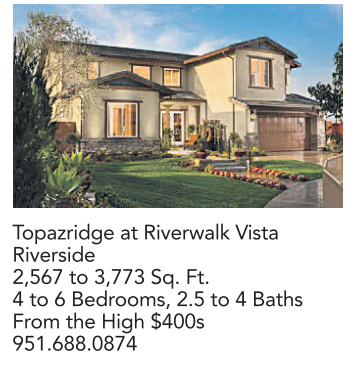 Topazridge at Riverwalk Vista Riverside 2,567 to 3,773 Sq. Ft. 4 to 6 Bedrooms, 2.5 to 4 Baths From the High $400s 951.688.0874