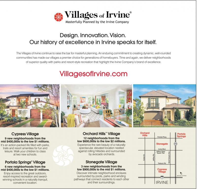 Design. Innovation.Vision. Our history of excellence in Irvine speaks for itself. The Villages of Irvine continue to raise the bar for masterful planning. An enduring commitment to creating dynamic, well-rounded communities has made our villages a premier choice for generations of homebuyers. Time and again, we deliver neighborhoods of superior quality with parks and resort-style recreation that highlight the Irvine Company’s brand of excellence. VillagesofIrvine.com Cypress Village 9 new neighborhoods from the mid $400,000s to the low $1 millions. It’s an action-packed life filled with parks, trails and resort amenities for fun and leisure. Walk your children to class at two new schools. Portola Springs ® Village 6 new neighborhoods from the mid $400,000s to the low $1 millions. Enjoy access to the great outdoors, resort-inspired recreation and awardwinning schools in a naturally tranquil, convenient location. Orchard Hills ™ Village 12 neighborhoods from the low $600,000s to the low $2 millions. Experience the rare beauty of a naturally spectacular, elevated location nestled against rolling hillsides and surrounded by avocado orchards. Stonegate Village 3 new neighborhoods from the low $900,000s to the mid $1 millions. Discover intimate neighborhood enclaves surrounded by pools, parks and winding pathways that connect residents to each other and their surroundings. Orchard Hills Portola Pkwy. Stonegate Irvine Blvd. Jeffrey Open Space Trail Trabuco Rd. Cypress Village 5 IRVINE Portola Springs 133