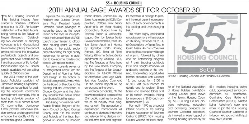 55+ Housing Council of the Building Industry Association of Southern California announces its 20th Anniversary celebration of the SAGE Awards, being hosted by Tim Sullivan of Meyers Research. Celebrating two decades of Shaping Advancements in Generational Environments (SAGE), the annual awards will honor the innovative professionals, projects and programs that have contributed to the enhancement of life for California residents age 55+. Tickets remain available, yet are selling quickly at 55SoCal.com.