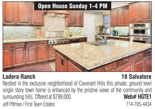 Open House Sunday 1-4 PM Ladera Ranch 18 Salvatore Nestled in the exclusive neighborhood of Covenant Hills this private, ground level single story town home is enhanced by the pristine views of the community and surrounding hills. Offered at $799,000. Web# HGTE1 Jeff Pittman / First Team Estates 714-785-4434