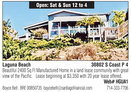 Open: Sat & Sun 12 to 4 Laguna Beach 30802 S Coast P 4 Beautiful 2400 Sq Ft Manufactured Home in a land lease community with great view of the Pacific. Lease beginning at $3,350 with 20 year lease offered. Web# HGUA1 Boyce Belt . BRE 00850735 boycebelt@santiagofinancial.com 714-333-7706