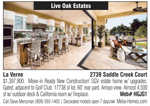 Live Oak Estates La Verne 2739 Saddle Creek Court $1,397,900. Move-in Ready New Construction! SGV estate home w/ upgrades. Gated, adjacent to Golf Club. 17738 sf lot, 60’ rear yard. Arroyo view. Almost 4,500 sf w/ outdoor deck & California room w/ fireplace. Web# HGJG1 Call Steve Merryman (909) 593-1405 | Decorated models open 7 days/wk Melia-Homes.com