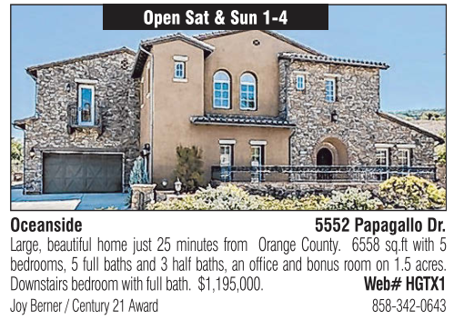 Open Sat & Sun 1-4 Oceanside 5552 Papagallo Dr. Large, beautiful home just 25 minutes from Orange County. 6558 sq.ft with 5 bedrooms, 5 full baths and 3 half baths, an office and bonus room on 1.5 acres. Downstairs bedroom with full bath. $1,195,000. Web# HGTX1 Joy Berner / Century 21 Award 858-342-0643