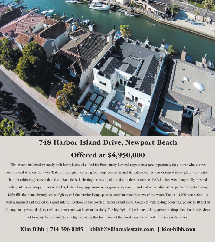 748 Harbor Island Drive, Newport Beach Offered at $4,950,000 This exceptional modern newly built home is one of a kind for Promontory Bay and represents a rare opportunity for a buyer who desires architectural style on the water. Tastefully designed featuring four large bedrooms and six bathrooms the master retreat is complete with custom built in cabinetry, Jacuzzi tub and a private deck. Reflecting the best qualities of a modern home the chef’s kitchen was thoughtfully finished with quartz countertops, a mosaic back splash, Viking appliances and a generously sized island and unbeatable views, perfect for entertaining. Light fills the home through walls of glass, and the interior living space is complimented by views of the water. The lot—4,000 square feet—is well manicured and located in a quiet interior location on the coveted Harbor Island Drive. Complete with folding doors that go out to 48 feet of frontage to a private dock that will accommodate two boats and a duffy. The highlight of the home is the spacious rooftop deck that boasts views of Newport harbor and the city lights making this home one of the finest example of modern living on the water. Kim Bibb | 714 396 0185 | kbibb@villarealestate.com | kim-bibb.com