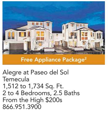 Alegre at Paseo del Sol Temecula 1,512 to 1,734 Sq. Ft. 2 to 4 Bedrooms, 2.5 Baths From the High $200s 866.951.3900