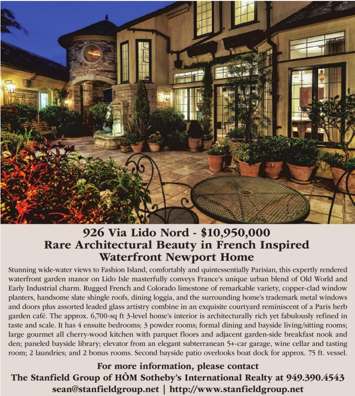 926 Via Lido Nord - $10,950,000 Rare Architectural Beauty in French Inspired Waterfront Newport Home Stunning wide-water views to Fashion Island, comfortably and quintessentially Parisian, this expertly rendered waterfront garden manor on Lido Isle masterfully conveys France’s unique urban blend of Old World and Early Industrial charm. Rugged French and Colorado limestone of remarkable variety, copper-clad window planters, handsome slate shingle roofs, dining loggia, and the surrounding home’s trademark metal windows and doors plus assorted leaded glass artistry combine in an exquisite courtyard reminiscent of a Paris herb garden café. The approx. 6,700-sq ft 3-level home’s interior is architecturally rich yet fabulously refined in taste and scale. It has 4 ensuite bedrooms; 3 powder rooms; formal dining and bayside living/sitting rooms; large gourmet all cherry-wood kitchen with parquet floors and adjacent garden-side breakfast nook and den; paneled bayside library; elevator from an elegant subterranean 5+-car garage, wine cellar and tasting room; 2 laundries; and 2 bonus rooms. Second bayside patio overlooks boat dock for approx. 75 ft. vessel. For more information, please contact The Stanfield Group of HÔM Sotheby’s International Realty at 949.390.4543 sean@stanfieldgroup.net | http://www.stanfieldgroup.net