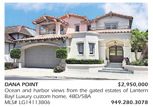 DANA POINT $2,950,000 Ocean and harbor views from the gated estates of Lantern Bay! Luxury custom home, 4BD/5BA MLS# LG14113806 949.280.3078