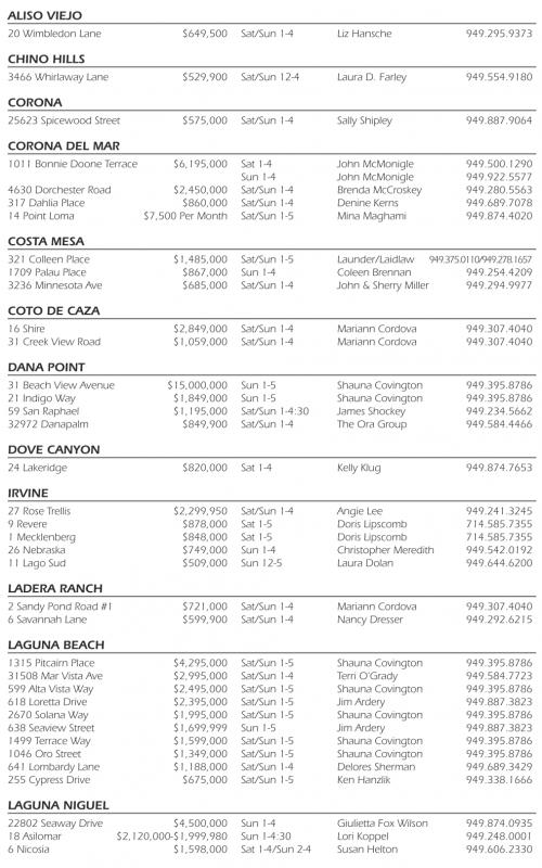 ALISO VIEJO 20 Wimbledon Lane $649,500 Sat/Sun 1-4 Liz Hansche 949.295.9373 CHINO HILLS 3466 Whirlaway Lane $529,900 Sat/Sun 12-4 Laura D. Farley 949.554.9180 CORONA 25623 Spicewood Street $575,000 Sat/Sun 1-4 Sally Shipley 949.887.9064 CORONA DEL MAR 1011 Bonnie Doone Terrace $6,195,000 Sat 1-4 John McMonigle 949.500.1290 Sun 1-4 John McMonigle 949.922.5577 4630 Dorchester Road $2,450,000 Sat/Sun 1-4 Brenda McCroskey 949.280.5563 317 Dahlia Place $860,000 Sat/Sun 1-4 Denine Kerns 949.689.7078 14 Point Loma $7,500 Per Month Sat/Sun 1-5 Mina Maghami 949.874.4020 COSTA MESA 321 Colleen Place $1,485,000 Sat/Sun 1-5 Launder/Laidlaw 949.375.0110/949.278.1657 1709 Palau Place $867,000 Sun 1-4 Coleen Brennan 949.254.4209 3236 Minnesota Ave $685,000 Sat/Sun 1-4 John &Sherry Miller 949.294.9977 COTO DE CAZA 16 Shire $2,849,000 Sat/Sun 1-4 Mariann Cordova 949.307.4040 31 Creek View Road $1,059,000 Sat/Sun 1-4 Mariann Cordova 949.307.4040 DANA POINT 31 Beach View Avenue $15,000,000 Sun 1-5 Shauna Covington 949.395.8786 21 Indigo Way $1,849,000 Sun 1-5 Shauna Covington 949.395.8786 59 San Raphael $1,195,000 Sat/Sun 1-4:30 James Shockey 949.234.5662 32972 Danapalm $849,900 Sat/Sun 1-4 The Ora Group 949.584.4466 DOVE CANYON 24 Lakeridge $820,000 Sat 1-4 Kelly Klug 949.874.7653 IRVINE 27 Rose Trellis $2,299,950 Sat/Sun 1-4 Angie Lee 949.241.3245 9Revere $878,000 Sat 1-5 Doris Lipscomb 714.585.7355 1Mecklenberg $848,000 Sat 1-5 Doris Lipscomb 714.585.7355 26 Nebraska $749,000 Sun 1-4 Christopher Meredith 949.542.0192 11 Lago Sud $509,000 Sun 12-5 Laura Dolan 949.644.6200 LADERA RANCH 2Sandy Pond Road #1 $721,000 Sat/Sun 1-4 Mariann Cordova 949.307.4040 6Savannah Lane $599,900 Sat/Sun 1-4 Nancy Dresser 949.292.6215 LAGUNA BEACH 1315 Pitcairn Place $4,295,000 Sat/Sun 1-5 Shauna Covington 949.395.8786 31508 Mar Vista Ave $2,995,000 Sat/Sun 1-4 Terri O’Grady 949.584.7723 599 Alta Vista Way $2,495,000 Sat/Sun 1-5 Shauna Covington 949.395.8786 618 Loretta Drive $2,395,000 Sat/Sun 1-5 Jim Ardery 949.887.3823 2670 Solana Way $1,995,000 Sat/Sun 1-5 Shauna Covington 949.395.8786 638 Seaview Street $1,699,999 Sun 1-5 Jim Ardery 949.887.3823 1499 Terrace Way $1,599,000 Sat/Sun 1-5 Shauna Covington 949.395.8786 1046 Oro Street $1,349,000 Sat/Sun 1-5 Shauna Covington 949.395.8786 641 Lombardy Lane $1,188,000 Sat/Sun 1-4 Delores Sherman 949.689.3429 255 Cypress Drive $675,000 Sat/Sun 1-5 Ken Hanzlik 949.338.1666 LAGUNA NIGUEL 22802 Seaway Drive $4,500,000 Sun 1-4 Giulietta Fox Wilson 949.874.0935 18 Asilomar $2,120,000-$1,999,980 Sun 1-4:30 Lori Koppel 949.248.0001 6Nicosia $1,598,000 Sat 1-4/Sun 2-4 Susan Helton 949.606.2330