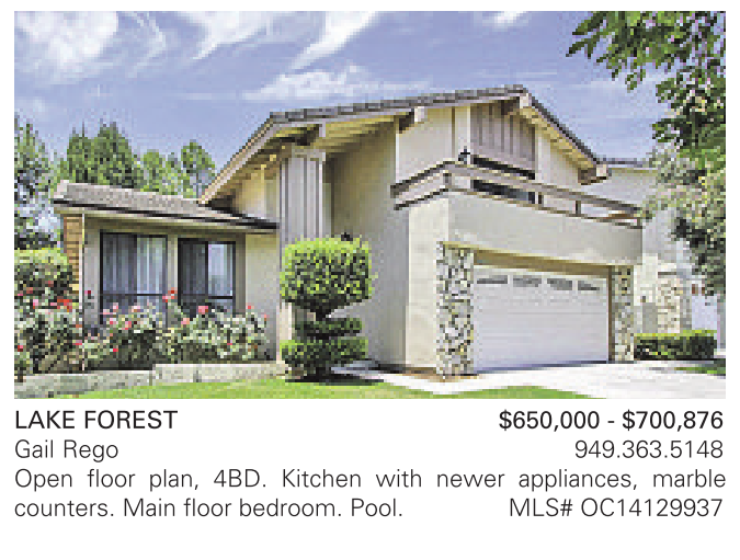 LAKE FOREST $650,000 - $700,876 Gail Rego 949.363.5148 Open floor plan, 4BD. Kitchen with newer appliances, marble counters. Main floor bedroom. Pool. MLS# OC14129937