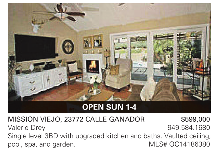 MISSION VIEJO, 23772 CALLE GANADOR $599,000 Valerie Drey 949.584.1680 Single level 3BD with upgraded kitchen and baths. Vaulted ceiling, pool, spa, and garden. MLS# OC14186380