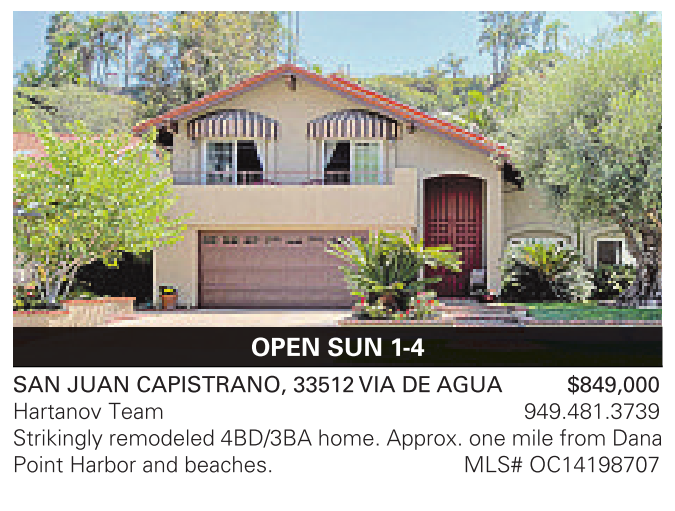SAN JUAN CAPISTRANO, 33512VIA DE AGUA $849,000 Hartanov Team 949.481.3739 Strikingly remodeled 4BD/3BA home. Approx. one mile from Dana Point Harbor and beaches. MLS# OC14198707