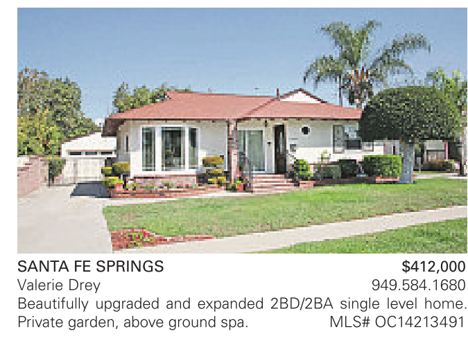 SANTA FE SPRINGS $412,000 Valerie Drey 949.584.1680 Beautifully upgraded and expanded 2BD/2BA single level home. Private garden, above ground spa. MLS# OC14213491